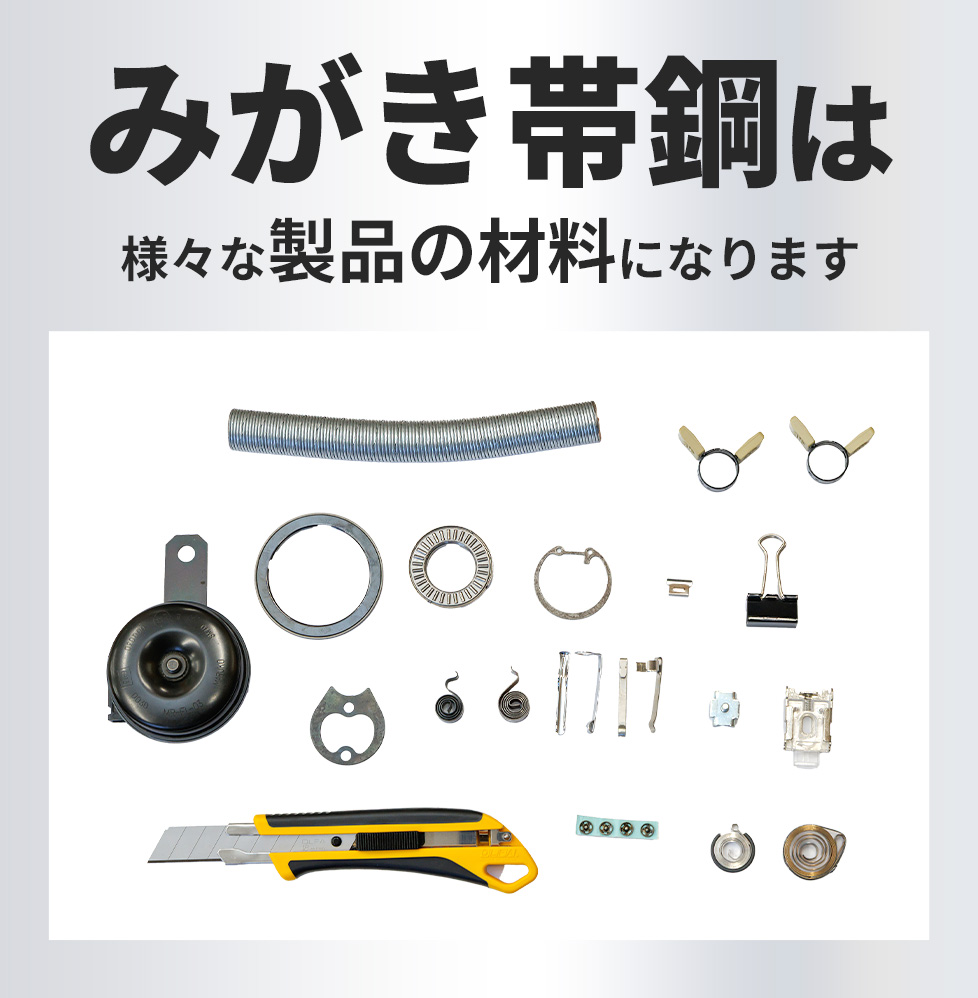 - みがき(特殊)帯鋼とは、冷間圧延された帯鋼(表面が磨かれたように美しい表面特性)で、表面粗さ・板厚精度・外観寸法品質を高めた鋼材です。精密部品やばね、プレス加工品など、高い品質が求められる用途に使用されます。